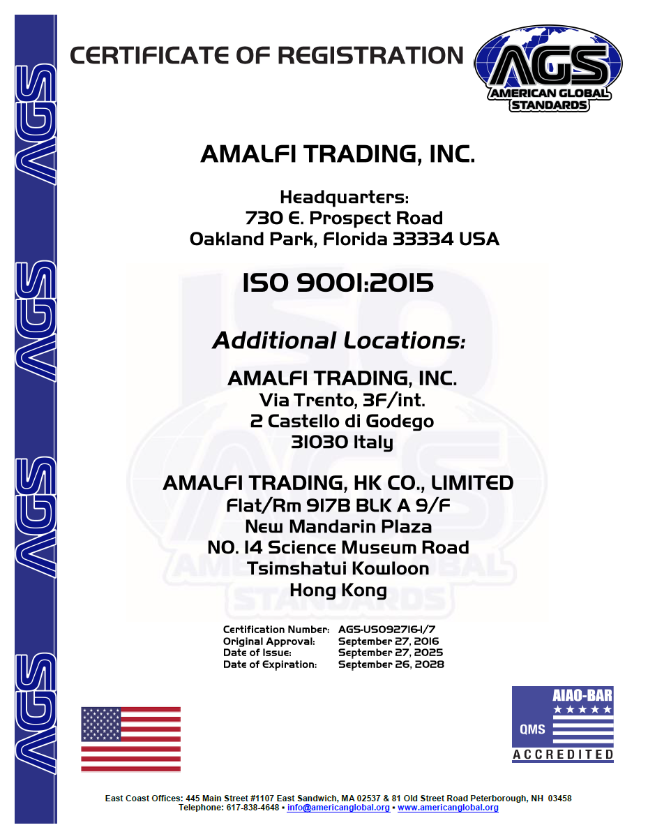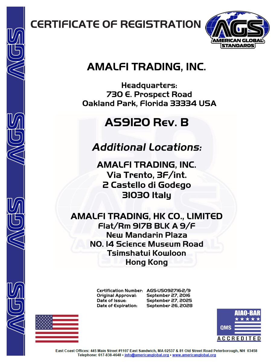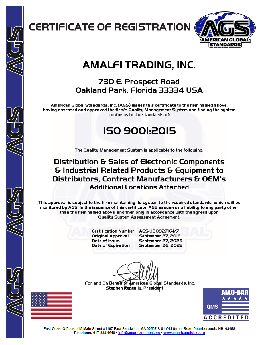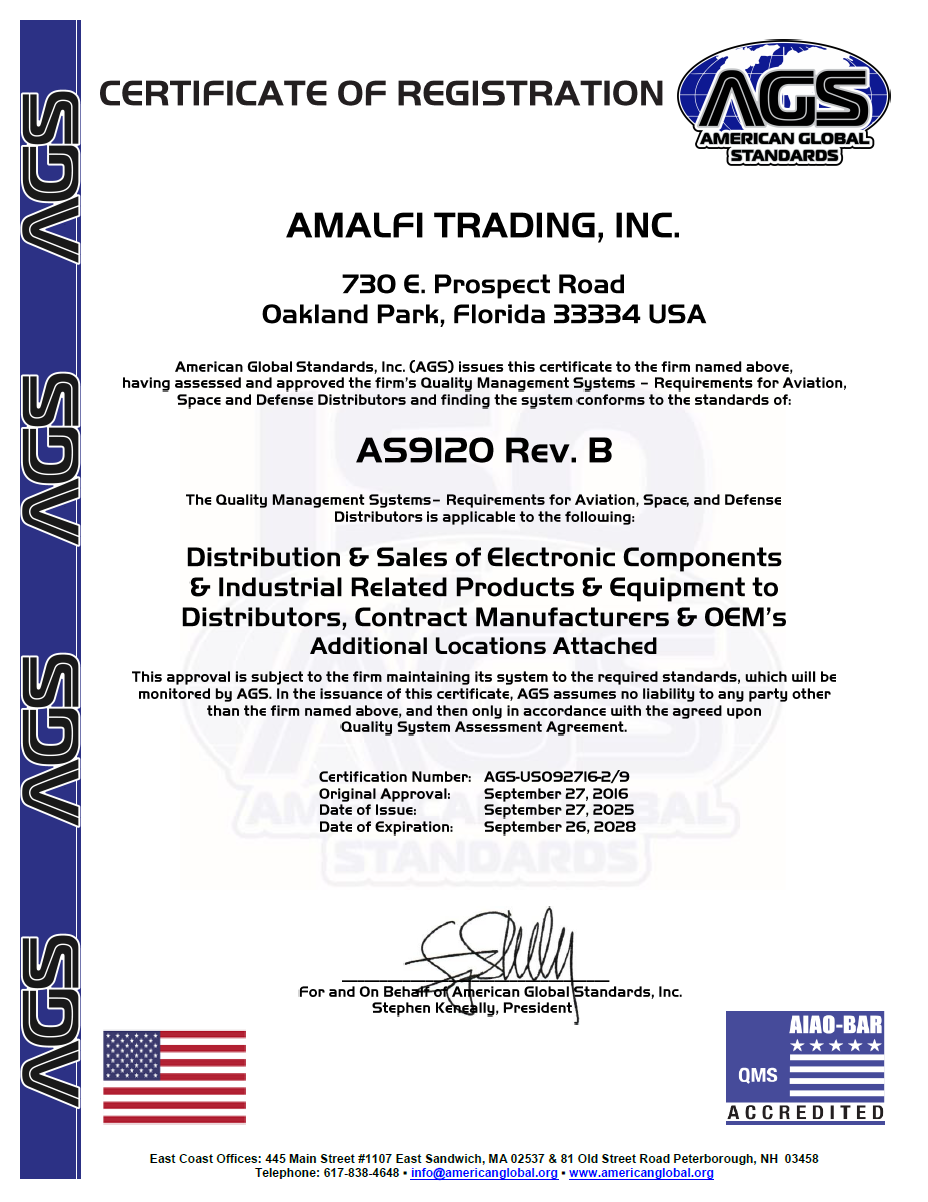 Amalfi Trading è certificata ISO 9001:2015 e AS9120 Rev A ed il nostro magazzino è certificato ANSI/ESD S20.20-2007.
